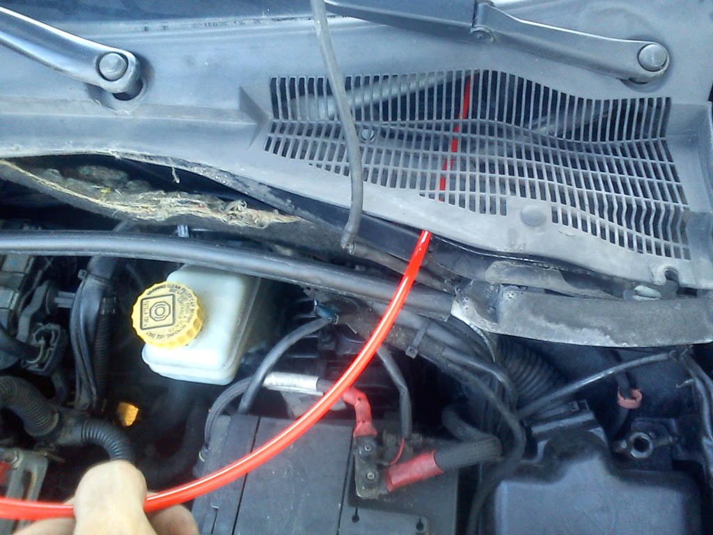 Wężyk pneumatyczny wprowadzamy więc przez przepust ("dławik") w podszybiu od strony kierowcy. Średnica np. 4 lub 6 mm. Plastik podszybia wystarczyło odkręcić (3 wkręty), wyjmować nie trzeba (nie trzeba też ściągać wycieraczek). Może się okazać, że trzeba będzie gumę przebić, naciąć, czy przewiercić - ostrożnie (nie naruszyć wiązki elektrycznej).