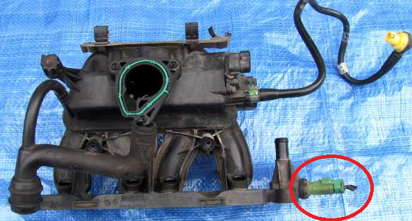 Czujnik temperatury płynu przy kolektorze ssącym do wymiany.