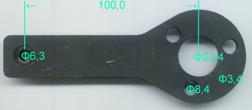 Wymiary "zdjęte" z fotografii. Otwory typu 6 oraz 8 milimetrów z kawałkiem, to otworki przelotowe na śruby M6 oraz M8, ich rozstaw (średnica) nie jest ważna, można by wykonać tzw. "fasolki" (byle zwrócone tak, aby kątów nie zakłócić). Załącznik: