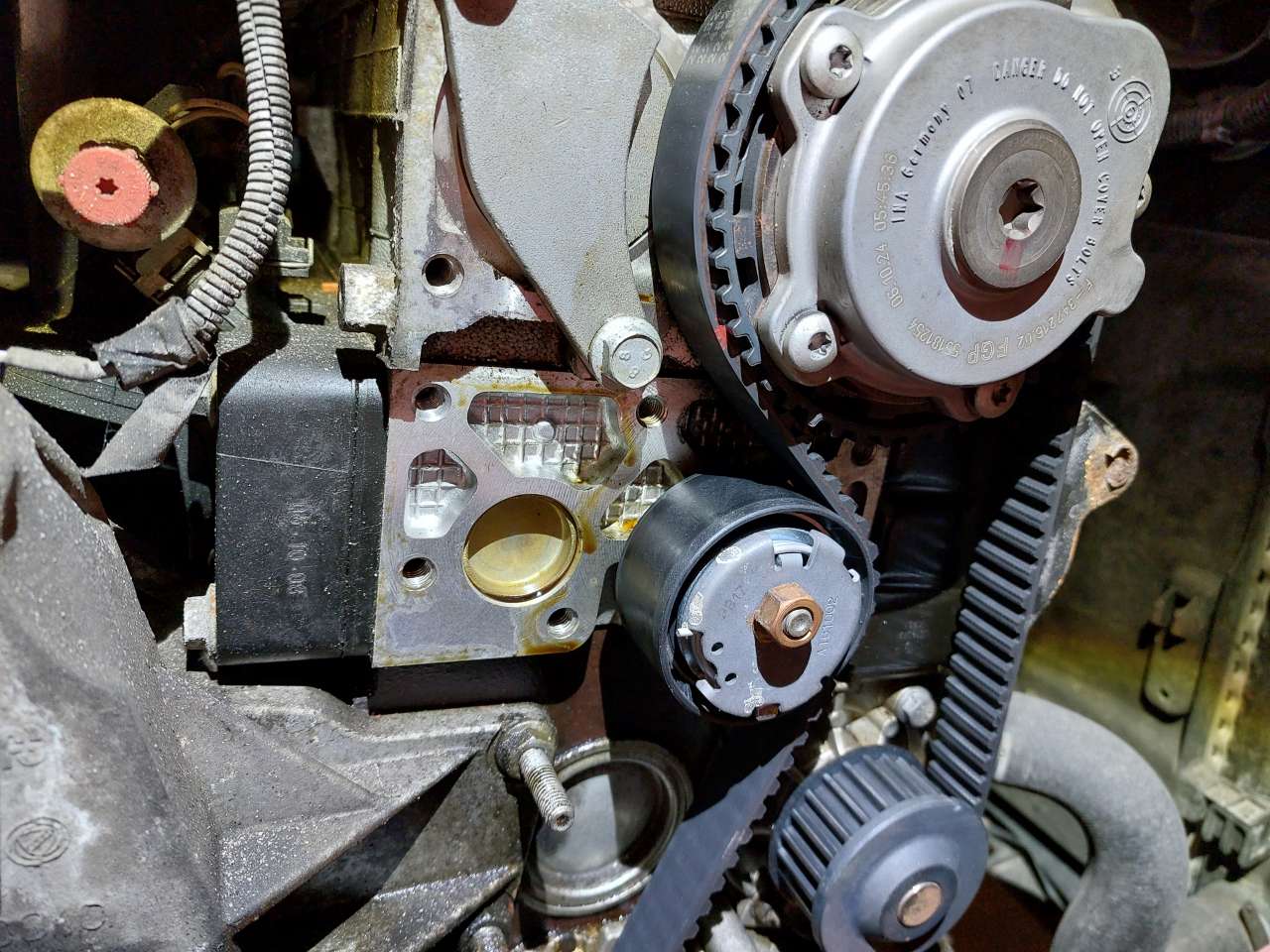 W 1.2 16V / 1.4 16V / 1.4 16V Tjet jak auto jest leciwe >10 lat to przy wymianie napędu rozrządu koniecznie wymienić oring korka otworu technologicznego. Podejrzany był simmering wałka wydechowego (chociaż w tych silnikach raczej nie padają, to nie 1.2 8V na wąskim pasku gdzie wymiana była obowiązkowa) a okazało się, że to oring korka (pierwszy raz coś takiego mi się trafiło). Załącznik: