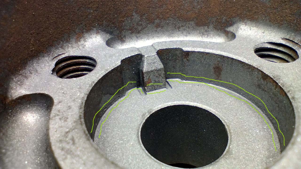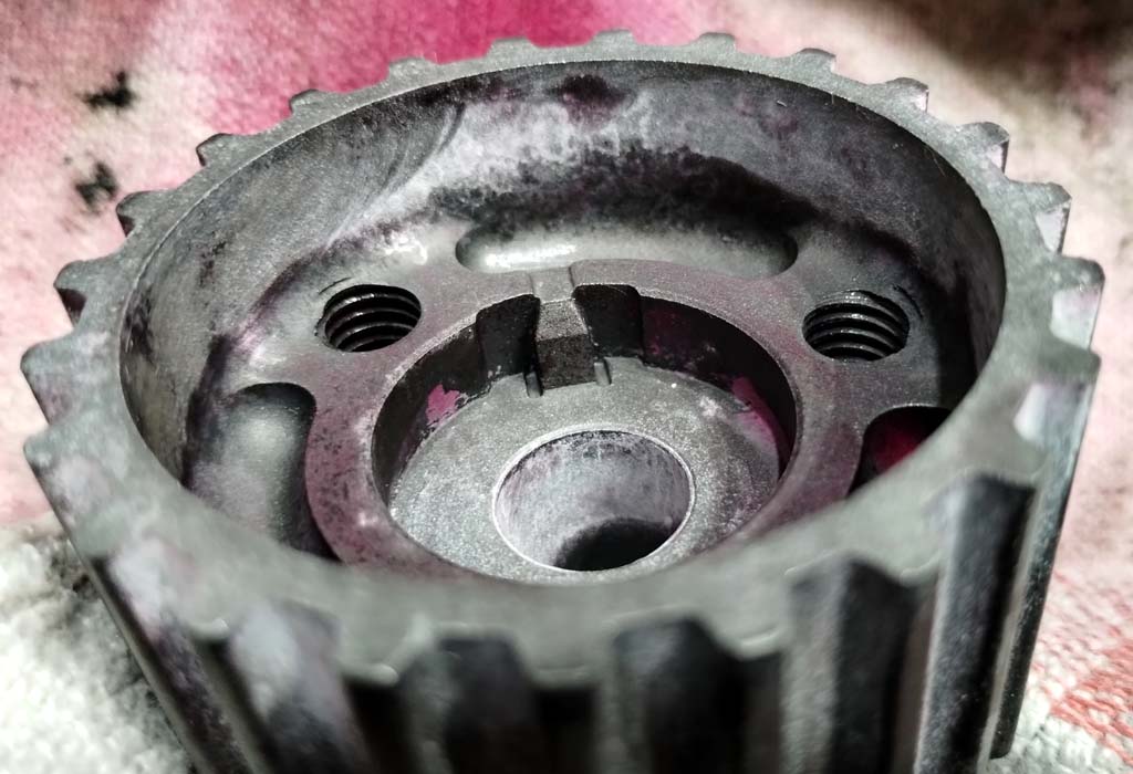 Inspekcja używanego koła paska rozrządu, z Allegro. Od wewnątrz po obwodzie widać ślady, na granicy gdzie przylegał wał. To może być tylko korozja, wilgoć się tam zbierała latami, ale też pęknięcia (albo wżery mogą zapoczątkować pęknięcie). Załącznik: