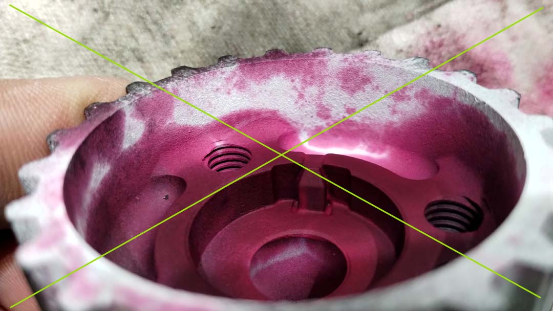 Po kolejnym myciu dalej penetrant siedzi wewnątrz struktury! Strzał sprężonym powietrzem w "klin", wpust...powoduje, że ze ścianki wyłazi czerwony syf! Odlewy potrafią tyle wciągać. Stąd jest metoda impregnacji odlewów w niektórych branżach, po prostu się żeliwne części maszyn moczy w żywicach itp. Załącznik:
