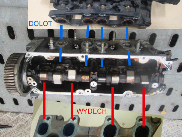 10. Schemat rozmieszczenia zaworów. Jeśli ktoś nie wie, to można sobie wykonać małe śledztwo. W internecie wyszukać fotografii głowicy i kolektorów, jak są ułożone. Zawory powinny być (przynajmniej w tak prostej rodzinie silników) na wprost otworów pod dany kolektor. Patrz fotomontaż. Większość silników całej grupy Fiata (Alfy i Lancie też) będzie mieć taki rozkład, ale nie wszystkie (więc uważać). Załącznik:
