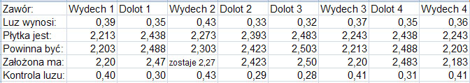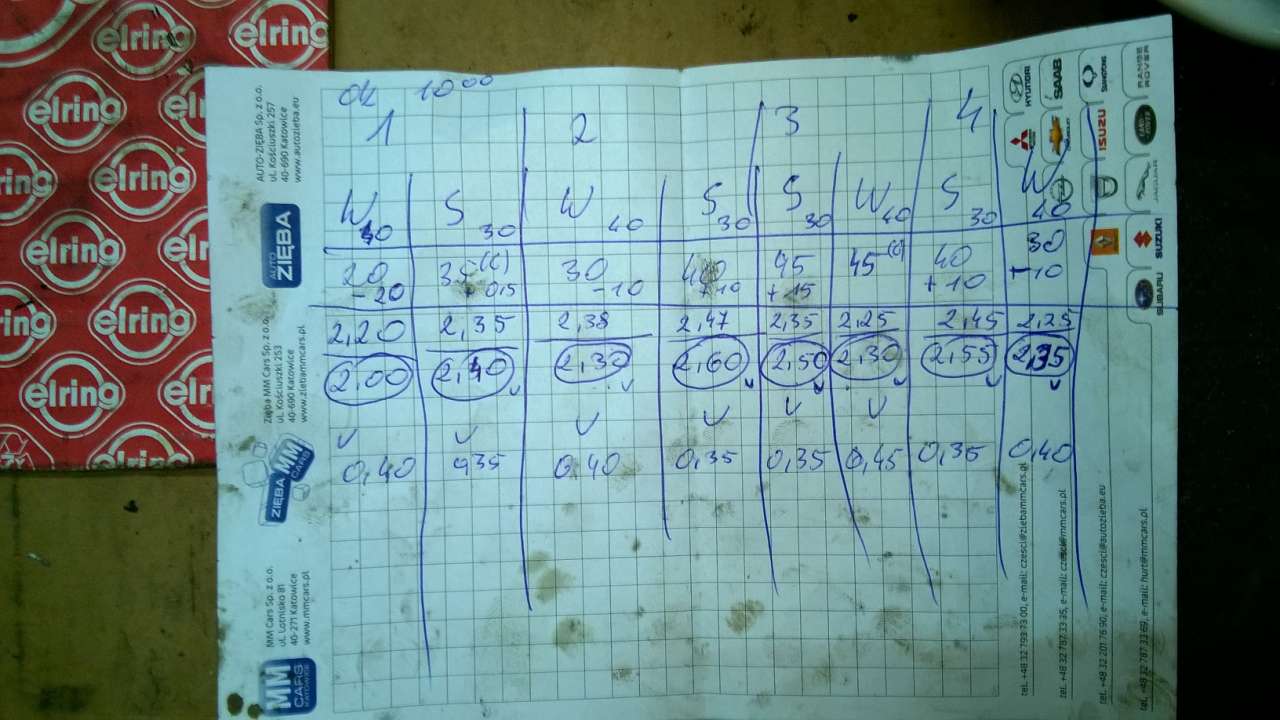 Po roku i prawie 17 tysiącach kilometrów (jest LPG), kolejne sprawdzenie i regulacja. Zmiany jakieś są. Czyli powiedzmy co 20 tysięcy warto kontrolować, jak ktoś ma gaz. Nie "przeciągać", nie "oszczędzać". Najgorszy rok temu cylinder 1 się uspokoił, ale pozostałe świrują, bo zostały pomieszane wtryskiwacze LPG (nie oznaczyłem który gdzie poszedł - mój błąd) przy ich czyszczeniu. Co ciekawe luzy się zwiększają na zaworach ssących, chyba się coś odkłada, nagary jakieś(?). Zobaczymy (czy luzy za rok urosną). Załącznik: