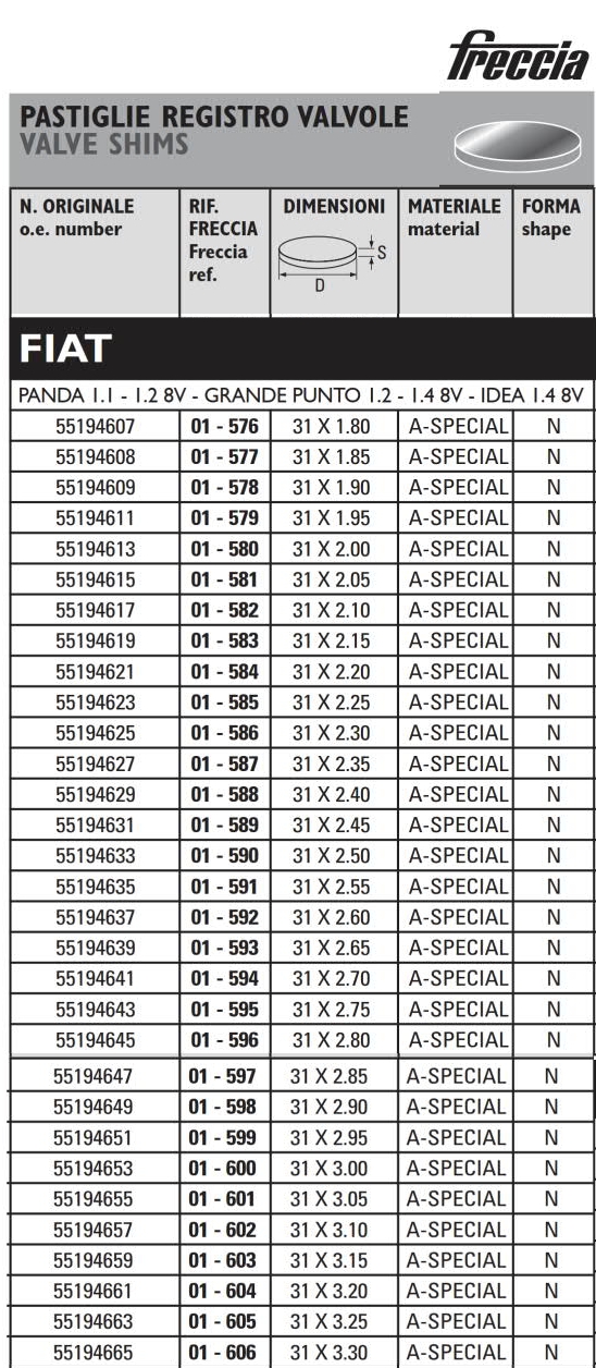 Znalazłem w intercarsie dostępne płytki regulacyjne (valve shims) o grubości od 1,8 mm włoskiej firmy Freccia. Są one widoczne jako dostępne. W załączeniu wycinek katalogu dotyczący Fiata Grande Punto. Kupowaliście/używaliście ich?