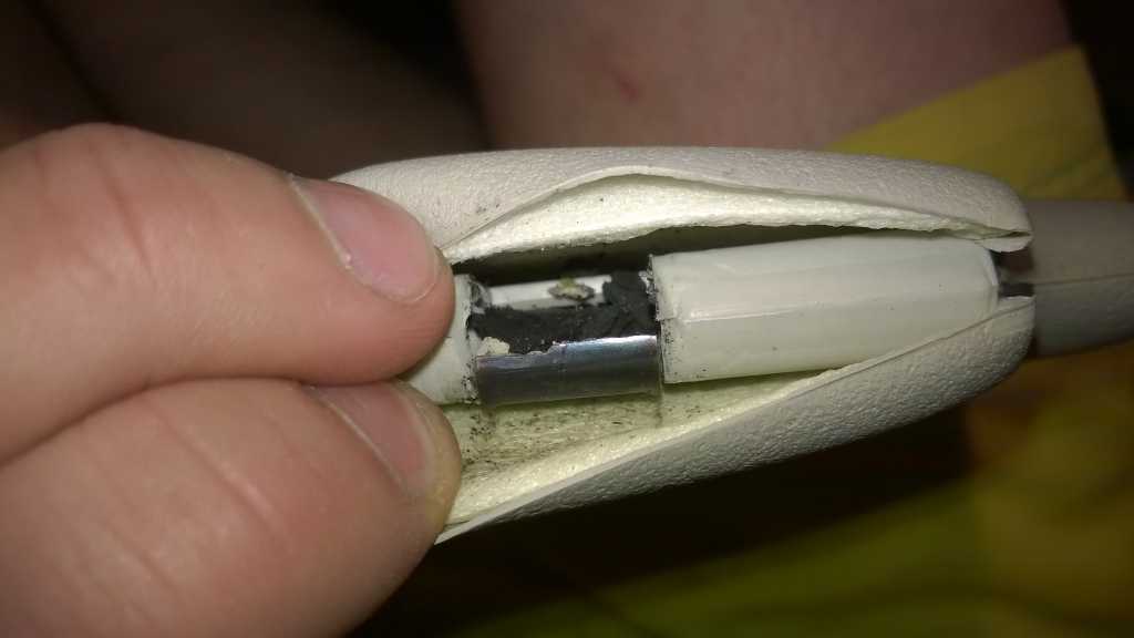 Gdy mamy to miejsce, nożykiem do tapet rozcinamy. Ważne aby miejsce rozciąć jednym, długim pociągnięciem po oryginalnym zgrzewaniu czy klejeniu. Niedokładne odcięcie może spowodować to, że podczas wymiany rozcięcie nam się dalej rozedrze. Jeżeli już rozetniemy to naszym oczom ukaże się biała gąbka. Jeżeli jej wcześniej nie rozcięliśmy, to robimy to teraz. Po tej operacji widać już blaszkę. Jak widać u mnie próbował to ktoś nareperować za pomocą kawałka gumy.