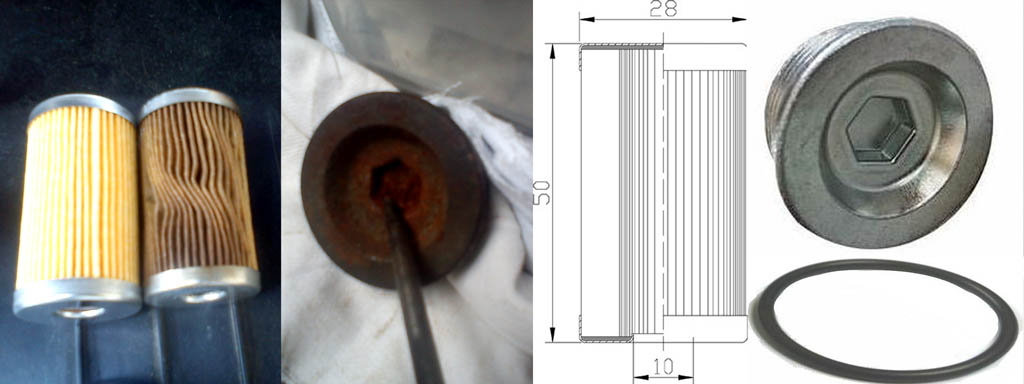 6. Porównanie starego i nowego filtra fazy ciekłej. Stary jest "wykręcony", bo korek tak go dociska, raczej nie powinno tak być. Wymiary: 50x28x10, jeden otwór (ten filtr nie może być przelotowy). Koreczek należy oczyścić z ewentualnej korozji i zabezpieczyć (pomalować). W ciężkich przypadkach można wymienić (są dostępne takie korki).