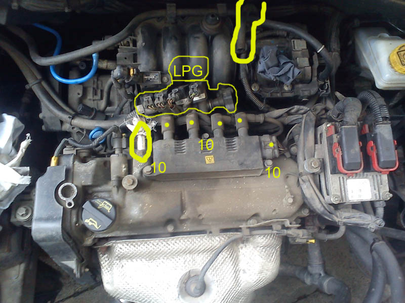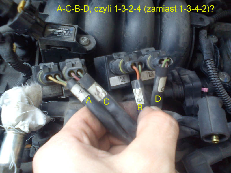 4. Jeśli jest LPG i przeszkadza, to przy demontażu uważać na oznaczenia wtryskiwaczy, o ile są (jak nie ma to wykonać własne znaki). Niestety oznaczenia wtryskiwaczy gazu wcale nie muszą odpowiadać w logiczny sposób kolejności zapłonów silnika na benzynie (1-3-4-2), bo przy montażu instalacji można to ustawić odpowiednim okablowaniem w wiązce (a może i nawet programowo) i/lub wężyki gazu pozamieniać. Tak też jest w tym przypadku. Załącznik: