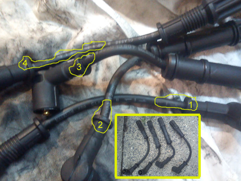 5. Przewody trzeba ściągać ostrożnie, nie ciągnąć za przewód, tylko jak najbliżej świecy, za koniec przewodów, zgrubienie. Miejsca w Grande Punto jest mało, można się wspomagać jakimiś szczypcami, tylko nie zgnieść przewodu (konstrukcja wrażliwa mechanicznie). Guma przewodu potrafi się "skleić" z ceramiką świecy. Warto rozważyć opcję zestawu "świece + przewody". Przewody różnią się długościami, a środkowe dwa (na cylindry 2 i 3) mają dodatkowy kołnierz, zgrubienie. Ułatwieniem jest numeracja, jaką można spotkać na przewodach, może być widoczna dopiero po wyczyszczeniu przewodu (nie wiem czy wszystkie to mają, dlatego przy demontażu zwrócić uwagę, zaznaczyć sobie). Załącznik: