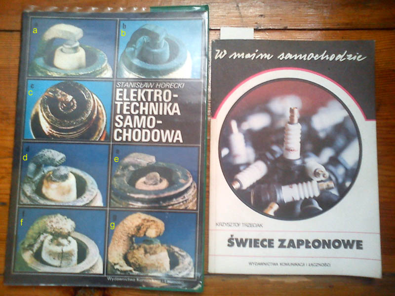 11. Na koniec banał jak w każdym poradniku: montaż wszystkiego dokonujemy w kolejności odwrotnej do demontażu [kto by na to wpadł]. Informacje co do momentów dokręcania świec są sprzeczne. Występują przedziały 15-20 Nm, 15-25, nawet do 30 gdzieś widziałem, wszystko dla gwintu M12 (25-30 to raczej dla wersji M14). Sensowne są liczby w "AutoData", czyli 18 Nm (plus/minus 2). Aby nie uszkodzić gwintu, świecę należy wstępnie wkręcić tylko i wyłącznie ręką, dwa paluszki, wtedy czuć, czy się równo wkręca (bo można "przegwintować", świeca wygniecie sobie nową spiralę w aluminium głowicy). Dopiero później nasadka, klucz. W nowej świecy jest świeża podkładka, podlega ona zgniataniu przy pierwszym dokręceniu. Dlatego przy nastawionym momencie trzeba będzie "kliknąć" kluczem dynamometrycznym 3-5 razy (bo materiał podkładki "płynie" pod naciskiem), za każdym razem świeca się jeszcze minimalnie poruszy (dokręci). Normalne zjawisko. Normalnie niczego nie trzeba smarować! Pokrycie nowej świecy ma współpracować z aluminium głowicy, tak, że nic się nie "zapiecze". Jeśli już, to "smarowanie" może być w sensie izolacyjnego środka (prawdopodobnie zwykły silikonowy, pewnie to samo co do hamulców), na świecę i przewód (od wewnątrz), aby się nie kleił do ceramiki. Literatura dla ambitnych kujonów. Według przykładów z okładki, to moje świece były nawet całkiem prawidłowe (obrazek "a"), tylko zużycie zmierzało już w stronę jak z obrazka "e". Załącznik: