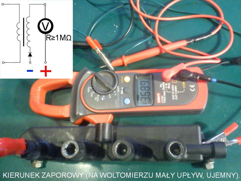 Po przyłączeniu odwrotnym woltomierz może pokazać najwyżej upływ diody (nie są doskonałe, przewodzą też słabo w kierunku zaporowym), jakieś niewielkie napięcie ujemne (np. -0,1 do -1 V), niektóre woltomierze mogą też "zgłupieć" i będą ciągle łapać zakres (mierniki z automatycznym wyborem zakresu). Załącznik: