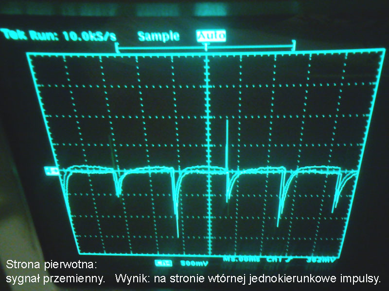 Tak na prawdę, to sama neonówka by wystarczyła, bo przy napięciu AC jarzą się oba pręciki wewnątrz, a przy jednokierunkowym (czy prawilnym DC) jeden bardziej się tli na pomarańczowo. Ale po wmontowaniu w śrubokręt efekt jest słabo widoczny (dlatego wspomagamy się LED-ówką). Test 4: dla elektroników, generator, oscyloskop, itd. Jak ktoś ma taki sprzęt, to nie potrzebuje porad. W skrócie można sprawdzić cewkę, podając bardzo małe impulsy przemienne, normalnie na stronę pierwotną i obserwować wtórną. Wpuszczamy AC, a wychodzi DC, wyprostowane, jednokierunkowe impulsy. A tak na prawdę, to można by też badać cewki odwrotnie, od strony wtórnej coś podawać i obserwować pierwotną (też się impulsy generują). Załącznik: