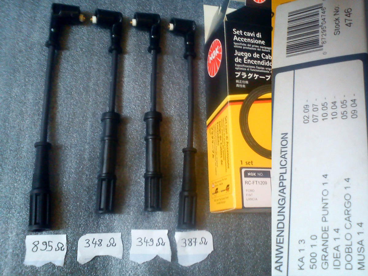 Szczegół na koniec: jeśli historia samochodu jest nieznana, to wymienić też przewody zapłonowe "w ciemno". Tutaj były dość stare (może nawet z pierwszego montażu) i auto po wymianie samych świec lekko drżało (znaczy silnik, wężyki, przewody podskakiwały) na biegu jałowym, bo przy demontażu było ciężko (przewody "przykleiły" się do świec i zostały naderwane prawdopodobnie). Po wymianie przewodów przestało, jest OK.  Jeszcze jedna ciekawostka. Nowe przewody Magneti-Marelli mają inny przedział rezystancji (możliwe, bo są różne technologie wykonania przewodów WN), od starych (tam było kilkaset omów i mały rozrzut wartości). Tutaj jest po kilka kilo omów, ale coś spory rozrzut (2,7-4,3 k) i to bez związku z długością (najdłuższy wcale nie ma największego oporu)! Auto odpala i jeździ normalnie. Teoretycznie dla układu wysokonapięciowego, takie różnice nie mają wpływu na iskrę, ale mogliby się postarać, źle to wygląda po prostu, taki "rozstrzał". Chyba, że kupiłem uszkodzone (np. ktoś kupił, zepsuł i zwrócił towar). Następnym razem kupię inne. Jak ktoś z was będzie zmieniać, to zmierzcie (stare i nowe) i wrzucajcie tu na forum wartości (zrobimy sobie taką "bazę danych"). Załącznik: