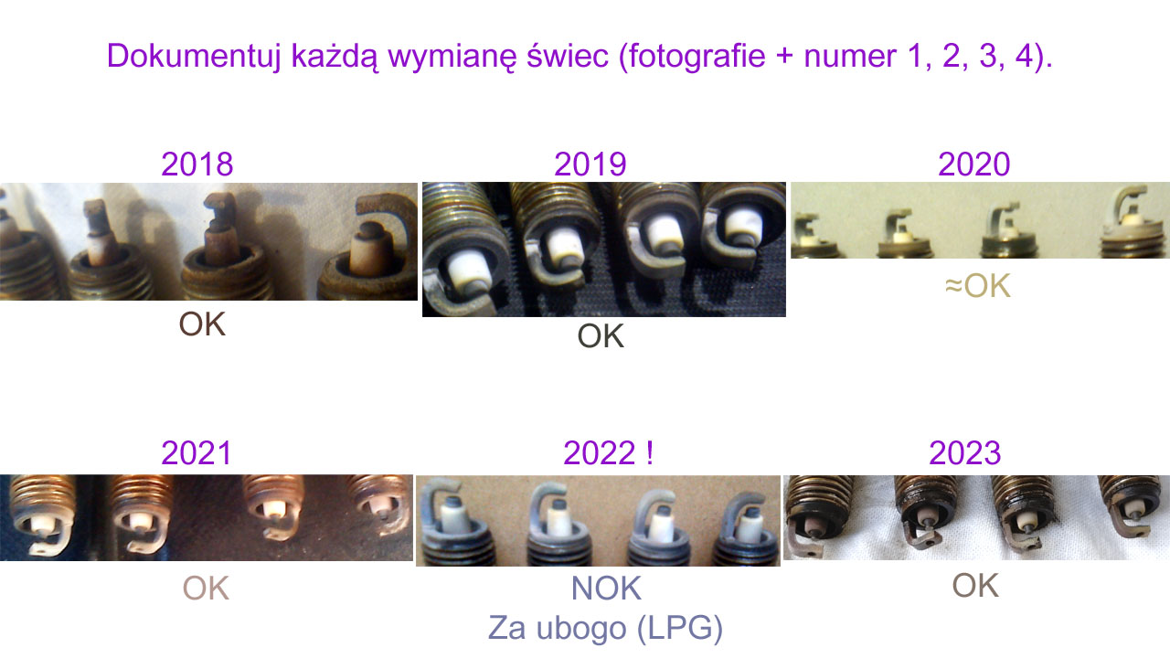 Po około roku użytkowania rezystancje się wyrównały, wszystkie mają około 350 omów (ten >800 miał widocznie słaby kontakt gdzieś i się połączenie teraz "wypiekło", wygrzało i jest OK). Także polecam, tani zestaw, można brać w ciemno. ░▒▓█▓▒░ [ Dodano: 31 Sie 2023, 22:18 ] ░▒▓█▓▒░ Dla potrzeb domorosłej diagnostyki warto dokumentować wymiany świec, fotografie robić. Może to pomóc (często po fakcie, ale jednak) w razie problemów. Załącznik: