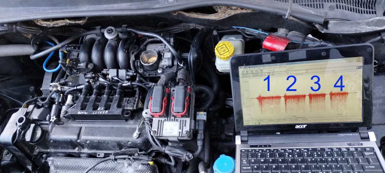 Pseudo "pomiary" kawałkiem drutu w miejscu mikrofonu z pozoru niewiele pokazują. Chociaż ogólny wygląd plików się zmienia przed i po ingerencji w silnik, wymianach, regulacjach. Tzw. obwiednia sygnału w porównaniu z następnym obrazkiem jest jakby "zaśmiecona". Stare świece, przerwa niewiele zwiększona (0,9x mm), ale są zaokrąglone elektrody (erozja). Czasy ładowania cewek przekraczają 2,10 ms. "Pomiary" nieczytelne, bo było skakanie z cylindra na cylinder (stąd są zlane w jedno). Załącznik: