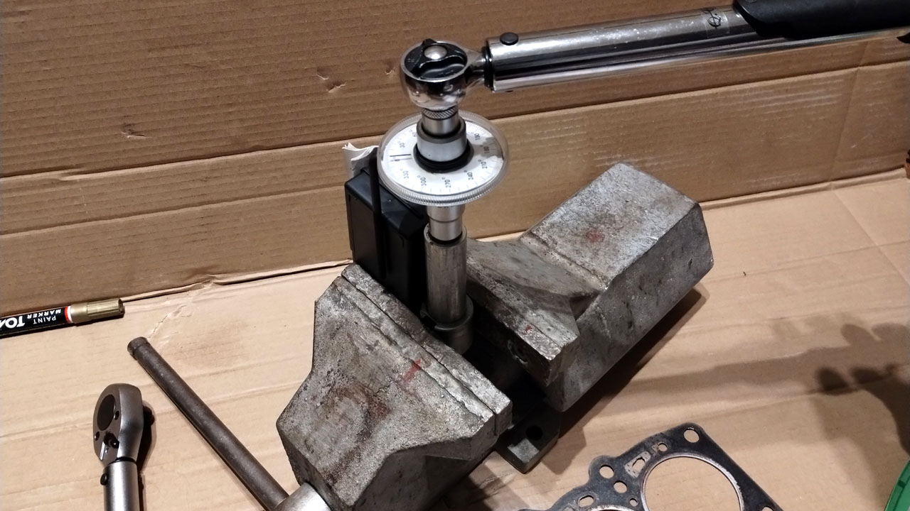 Kręcenie w imadle. Klucze dynamometryczne i kątomierz. Jednoczesny pomiar jednego i drugiego jest bardzo trudny, bo np. zatrzymanie się po drodze zaburza moment (tarcie statyczne VS dynamiczne), jak się zatrzymasz, to ciężej ruszyć i takie "wyniki" się prawie do niczego nie nadają (prawie robi różnicę). Załącznik: