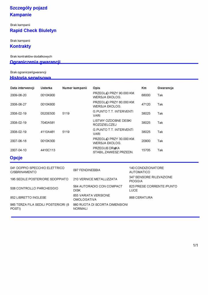 Witam, mam kilka pytań do użytkowników Grande Punto 1.3 Multijet 90KM z 6 biegową skrzynią. Rozważam zakup takiego auta... 2006 rok, 140 tysięcy przebiegu. Nie miałem nigdy doświadczenia z Fiatami dlatego chciałbym się Was poradzić jakich napraw można się spodziewać w pierwszej kolejności. Wiem, że nie było jeszcze wymieniane sprzęgło. Przy jakim przebiegu najczęściej się je wymienia w tym aucie ? To samo z dwumasowym kołem zamachowym ? przy jakim przebiegu spodziewać się wymiany i jakie to są koszty ? Sprawdziłem po VINie w ASO... przebieg wydaje się realny... zastanawiam się czy jest wyposażony w DPF ? podobno można to sprawdzić na liście wyposażenia ? w załączniku wydruk z serwisu... DPFa nie widzę... bardziej zastanawia mnie punkt 965 w opcjach... trzeci rząd siedzeń (8 miejsc) ? wygląda jak wydruk od Ducato a nie od Grande Punto  Czy po ewentualnym zakupie wymieniać coś poza standardowo olejem i filtrami ? na co zwrócić uwagę ? zdziwiło mnie to, że właściciel rok temu przy przebiegu około 120 tysięcy wymieniał turbinę... ktoś miał podobny problem ? Zastanawiam się czy za chwilę znowu nie będzie trzeba jej wymienić ? z góry dziękuje za wszelkie wskazówki... generalnie wygląda wszystko zachęcająco... podobno późniejsza historia serwisowa też jest udokumentowana więc może warto się skusić i nie żałować za miesiąc
