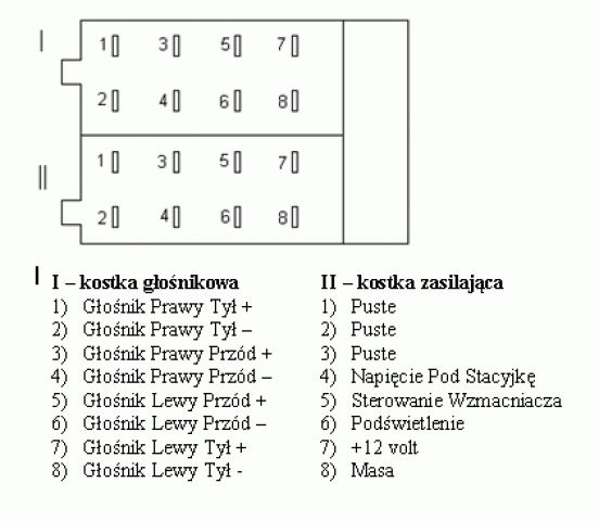 Czołem forumowicze  Nie chcę powielać tematów więc podłączam się pod już istniejący. Kupiłem sobie nowego Pioneera, żeby zastąpić nim starego kaseciaka. Nie było to radio fabryczne, tylko jakiś stary Pioneer włożony przez kogoś. Niestety instalacja widać, że również została przerobiona na jakąś płaską kostkę, która pasowała do tego radia. Byłem w kilku sklepach elektrycznych pytając o jakąś przejściówkę na to cudo, bo w nowym radiu mam już standardowe kostki ISO, takie jak wstawiłem poniżej. Niestety nigdzie nie meli, więc nim kupię złączki i rozwalę starą kostkę i zacznę bawić się w łączenie kabelków chciałem zapytać czy w ogóle coś takiego istnieje? Jeśli nie to w jaki sposób ogarnąć kolory starych kabli? Nowe złączki są pięknie opisane