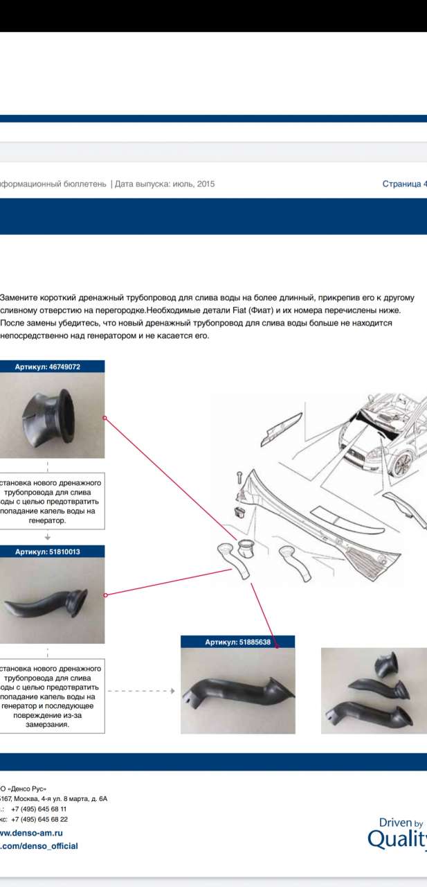 Czyli to jakaś trzecia wersja. Bo fabrycznie były (w Grande) krótkie, później poprawione dłuższe (foto). Ty pokazujesz jeszcze inny, dłuższy...czyli co, w EVO/2012 stwierdzili, że jeszcze za mało(?).  A tak na prawdę wszystkie są "złe", bo woda jak nie na alternator, to leci na belkę/wózek/sanki przednie (kierunek odpływu bez większego znaczenia), a to konstrukcja spawana, szybciej skoroduje (były na forum przypadki, że ktoś musiał wymieniać, z Opla Corsy "D" podobno pasuje - to tak na marginesie).