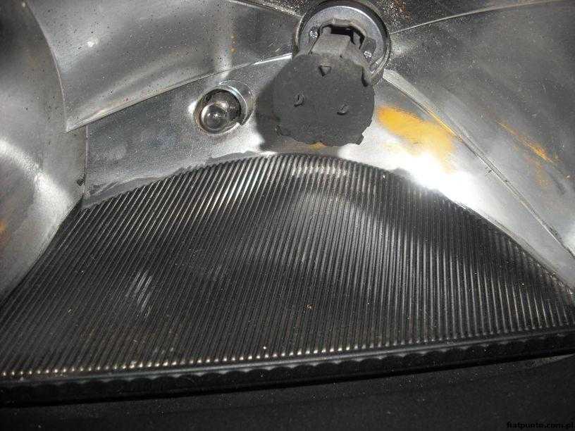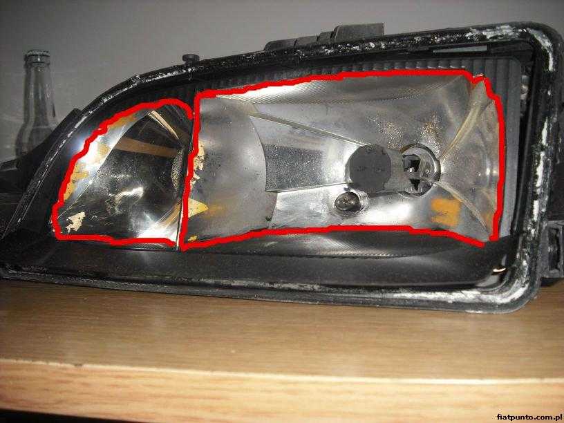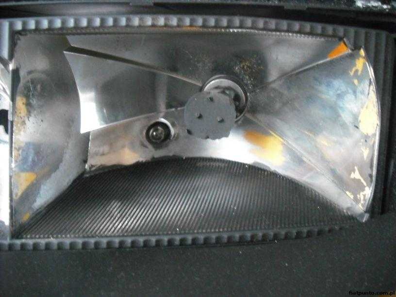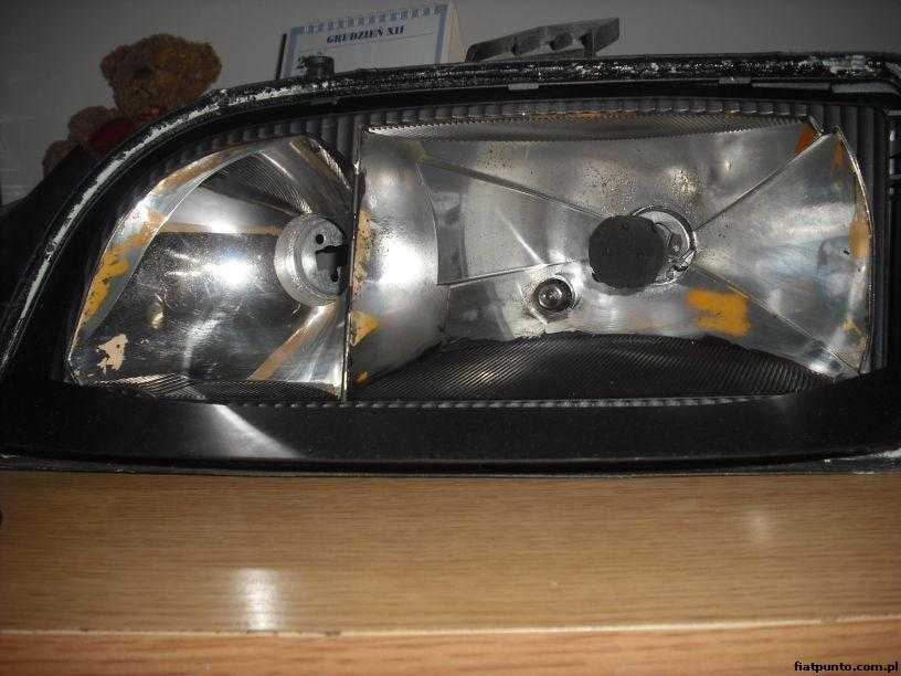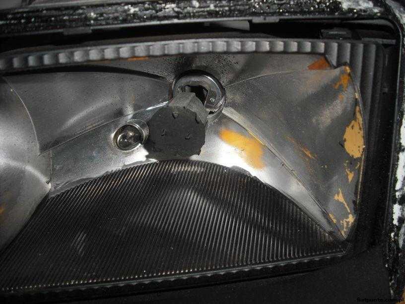 ). Może zdarzyć się, że niestety mimo iż będziemy delikatni odbłyśnik może gdzieś odprysnąć. Wtedy takie miejsce malujemy srebrną farbą o jak najjaśniejszym odcieniu a następnie lakierem bezbarwnym (jakimś małym pędzelkiem). Kiedy wszystko już będzie suche denaturatem można umyć odbłyśnik. Korzystając z okazji że lampa jest rozklejona myjemy szkło od wewnątrz (lampa wygląda jak nowa