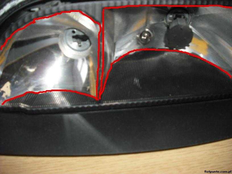 Na fotkach widać co jest pomalowane. Wszystko to co zostało srebrne musi zostać zaklejone. Tutaj trzeba uważać, gdyż odbłyśnik jest bardzo delikatny i może oderwać się kiedy będziemy odklejać taśmę po malowaniu. Żeby tego uniknąć należy kleić środek lampy tak, aby w większości był on przysłonięty jakimś papierem a taśma przyklejana była na samych krawędziach i to dosłownie 2 - 3 mm powierzchni taśmy powinno stykać się z odbłyśnikiem, nie więcej. Na zdjęciach zaznaczyłem na czerwono krawędzie na których powinna być taśma: