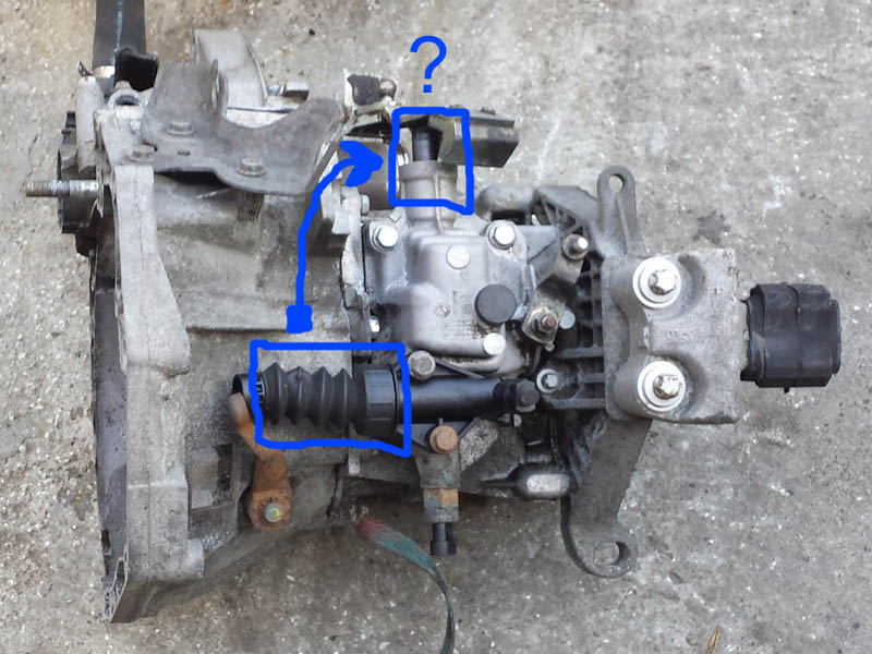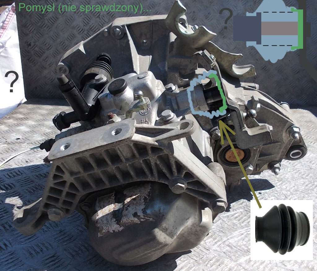 Patrząc na skrzynię pojawia się oczywisty pomysł, aby dać tam "harmonijkę" jak na siłowniku sprzęgła, nawet nałożyć tylko na obudowę wybieraka, drugi koniec zostawić luźno (nie zaciskać na trzpieniu, skoro jak ktoś pisał nie ma miejsca, bo on "dobija", chowa się do końca?). Załącznik: