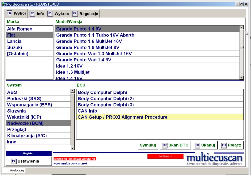 Dopiero użycie programu MultiEcuScan 1.7 pozwoliło na poprawną aktywację tempomatu. Należy wejść w opcję CAN Setup/PROXI Alignment Procedure i tam włączyć dwie opcje: 1. Dźwignia sterowania tempomatu (od MY2008)2. Kontrolka Tempomatunastępnie wykonać OSIOWANIE PROXI i powinno działać. Załącznik: