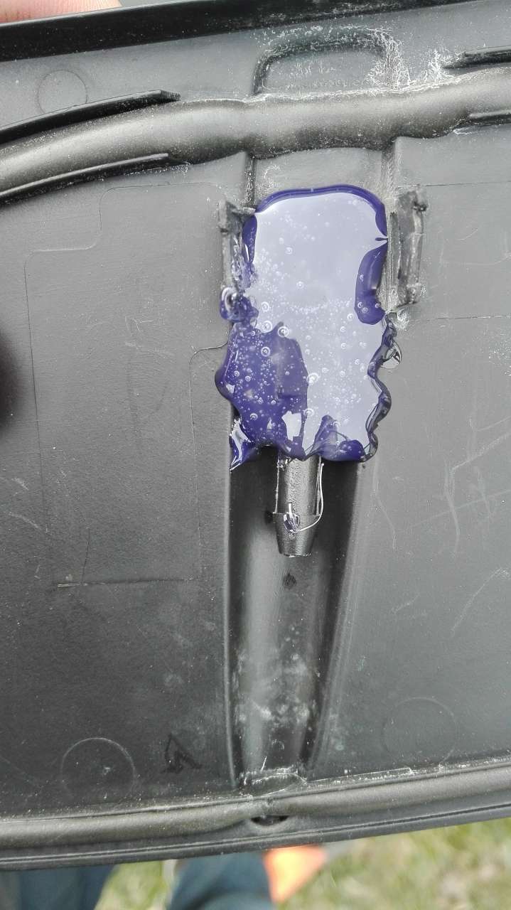zaklejamy "wargi" spryskiwacza czarnym klejem z pistoletu i wkładamy go na godzinę do zamrażarki aby był twardy!!! Następnie tarczką dremela nacinamy szczelinę pod kątem ok 20stopni tak troch zahaczając o górną wargę spryskiwacza. Najlepiej nieco asymetrycznie ,aby tym razem uwzlędnić środek szyby przy "sikaniu" Nacinamy tak głęboko aż dojdziemy do otworu podającego płyn Tak wycięta szczelina psika znacznie wyżej a strumień układa się bardziej w wachlarz.