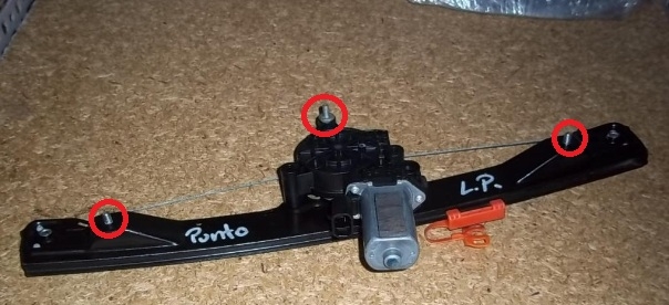 [ Dodano: 02 Lip 2012 21:09 ]Wymieniłem dzisiaj cały mechanizm. Nie ma jakiegoś większego problemu z tym. Po rozkręceniu tapicerki, kilka wkrętów od dołu i 3 śruby w okolicach podłokietnika schodzi cała tapicerka. Następnie zdjąłem tą piankę i już można dostać się do samego mechanizmu. Trzymają go również 3 śruby - zaznaczone na zdjęciu. Należy jeszcze wyjąć bolec, który przechodzi przez otwór w szybie. Zdejmuje się zabezpieczenie bolca i wyciąga z całym mechanizmem. Największy problem to przełożenie silniczka, bo nie wchodził on w skład nowego mechanizmu. Trzeba uważać żeby nie spadała zawinięta linka na kole napędzającym przez silniczek. Później tylko poskładać wszystko i działa