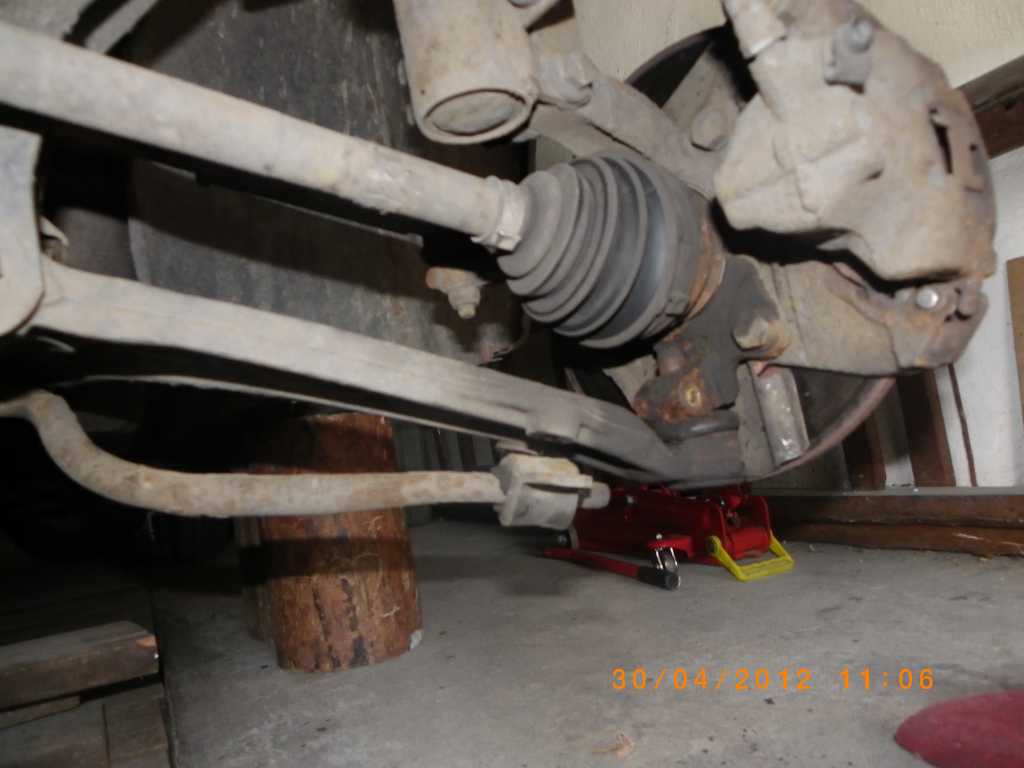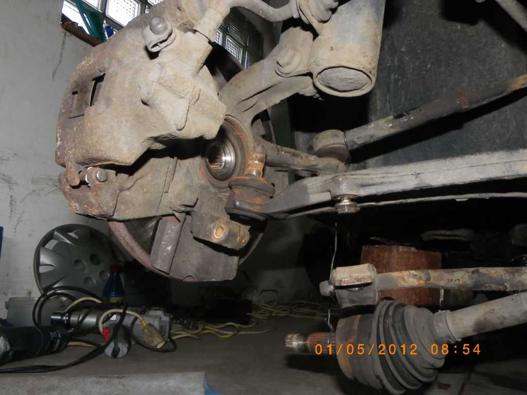 4) Odkręcić śruby sworznia wahacza i wybić go – żeby nie sprężynowało podstawić podnośnik pod tarczę hamulcową i podnieść ją. Załącznik:
