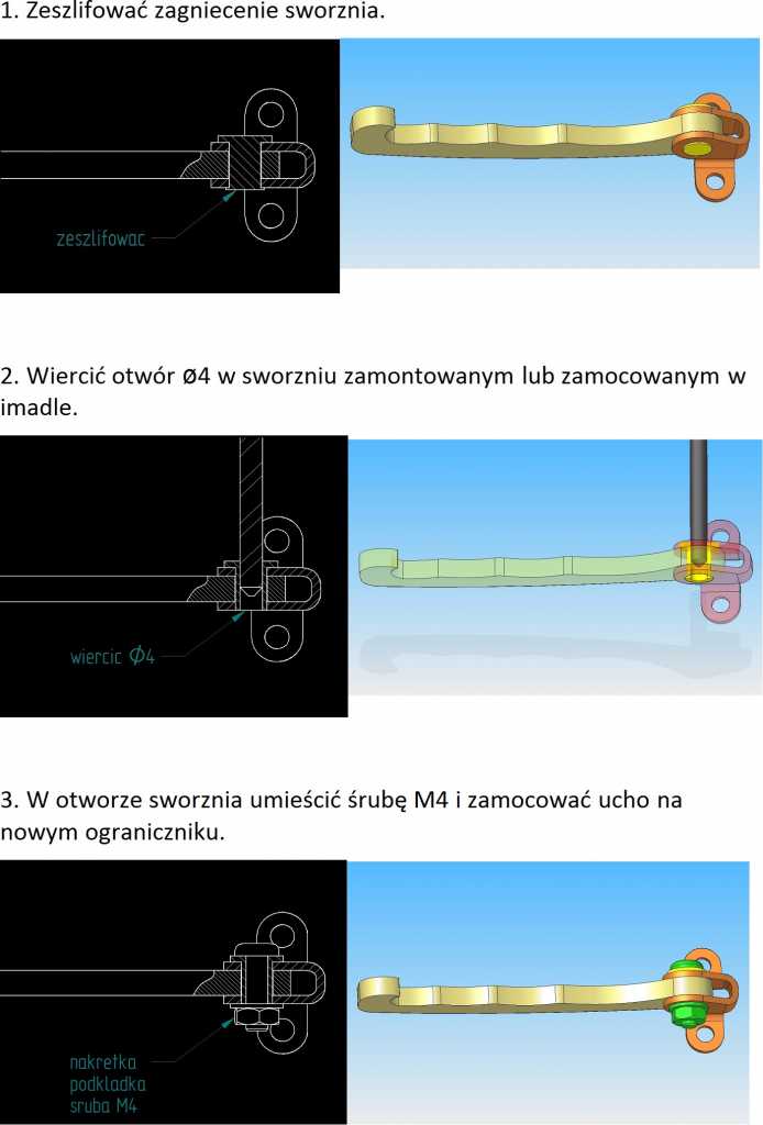 Jeżeli nasz nowo zakupiony ogranicznik jest bez ucha mocującego (co często się zdarza), możemy wykorzystać ucho ze starego ogranicznika. W tym celu, trzeba przerobić sworzeń starego ucha (stary oryginalny sworzeń jest na stałe zamontowany w ograniczniku, jest niewymienialny). Sworzeń trzeba rozwiercić i z wykorzystaniem śruby M4 zamocować na nowym ograniczniku. Poniższa instrukcja przedstawia jak to zrobić.