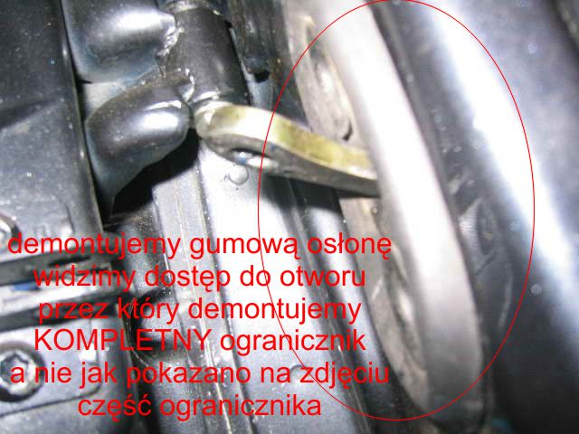 To co pokazano w poradniku http://punto.org.pl/zrobtosam/model188czylimk2imk2fl/76 to proszenie się o problemy i koszty. Jak pisałem wyżej, za strzelanie odpowiada "jajowatość" otworu. Nie wspomnę o fakcie, iż prace w okolicach słupka czy drzwi z młotkiem, nie należą do najrozsądniejszych..... Na przykładzie zdjęcia z poradnika - http://punto.org.pl/zrobtosam/model188czylimk2imk2fl/76 pokazałem, co należy zdemontować aby mieć miejsce do manewrowania ogranicznikiem. Załącznik: