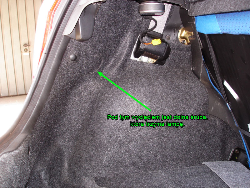 Piechuxt napisał(a): Nic nie trzeba Piechuxt napisał(a): Druga jest za dywanikiem w bagażniku  Czyli za subwooferem  Musiałbym pójść do garażu, ale raczej trzeba odkręcić sub'a (2 śruby na górze i 1 wkręt na dole). Np. z prawej strony aby dostać się do dolnej śruby trzeba odkręcić mocowanie gaśnicy. Ogólnie masz 2 śruby. Jak z tyłu odciągniesz trochę lampę to ściśnij wtyczkę, aby móc ją wyjąć. Następnie do odkręcenia jest ok. 6 śrubek aby zdjąć klapkę, w której są zamontowane żarówki.