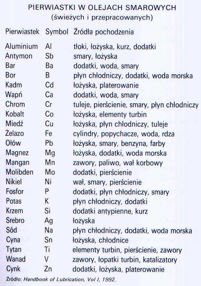 Przykładowa lista pierwiastków i źródła pochodzenia. Oczywiście, gdyby badanie oleju było rutynowe w motoryzacji. Załącznik:
