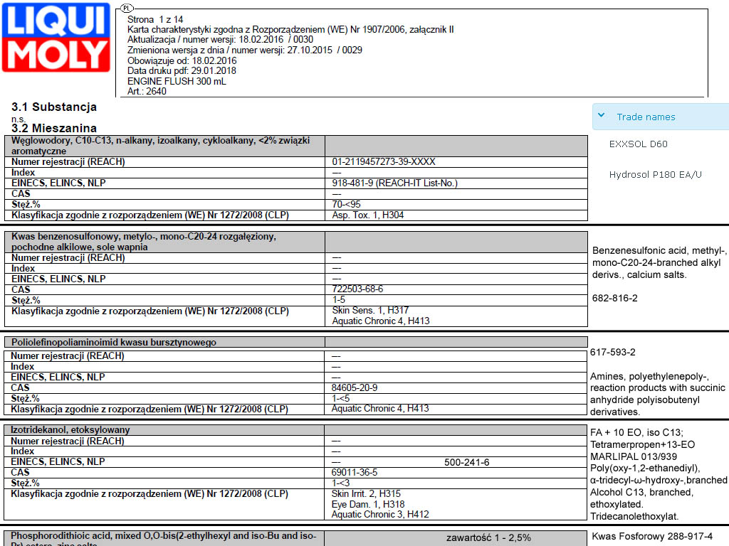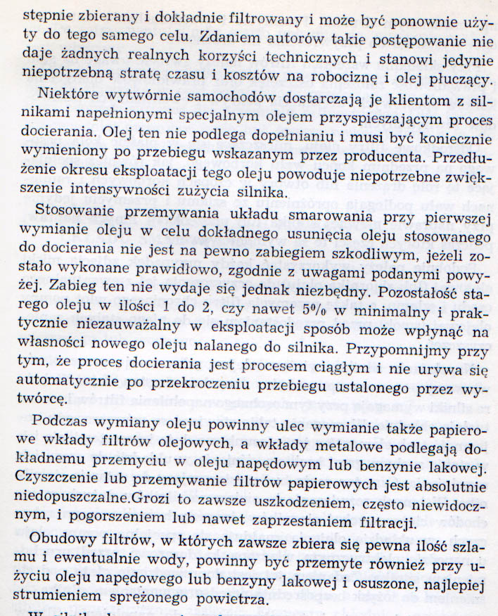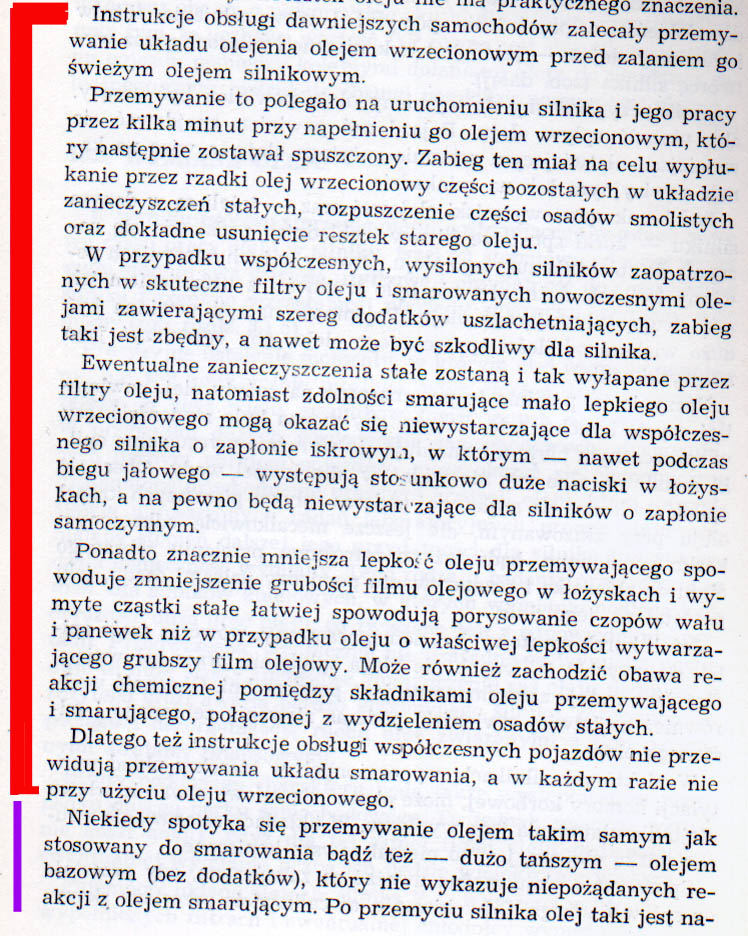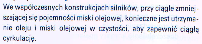Tu uwaga na płukanki, bo mogą oderwać zanieczyszczenia/nagary i przytkać smok pompy. Na YouTube ktoś nagrał fajny filmik, że przed płukanką w świeżo zakupionym, używanym (czyli nieznanym) samochodzie, wypada dokonać inspekcji, zdjąć miskę i ją mechanicznie wyczyścić. Wcześniej nie wiecie, co jest w silniku. Starą metodą (w erze olejów mineralnych) płukania był po prostu olej (silnikowy lub warunkowo dopuszczalny tańszy od docelowego, nawet hydrauliczny, wrzecionowy, maszynowy). Albo po prostu nie "oszczędzać" i częściej zmieniać olej (to nie będzie potrzeby płukania). Wszelkie wynalazki, jak nafta, rozpuszczalniki, są używane, ale do mycia części po wymontowaniu z silnika, normalnie taka chemia nie powinna się w silniku znaleźć. Płukanie olejem jest za drogie, dlatego mało popularne (przynajmniej w motoryzacji). Ale wzmianki o tym w literaturze kiedyś były. Załącznik: