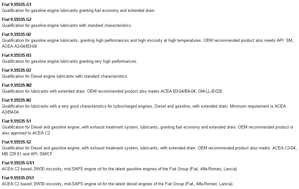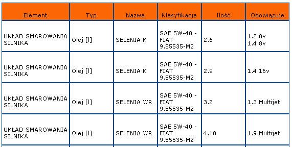 Co do pełnej Fiatowskiej normy (ostanie literki po numerze), to jest niekonsekwencja w "eLearn". Bo z takiej listy w internecie wynika, że benzyniaki i diesle powinny mieć nieco inną normę (a nie wszystkie "-M2"), chociaż nazwy oleju "Selenia" się różnią (jakieś "K" oraz "WR"). Załącznik: