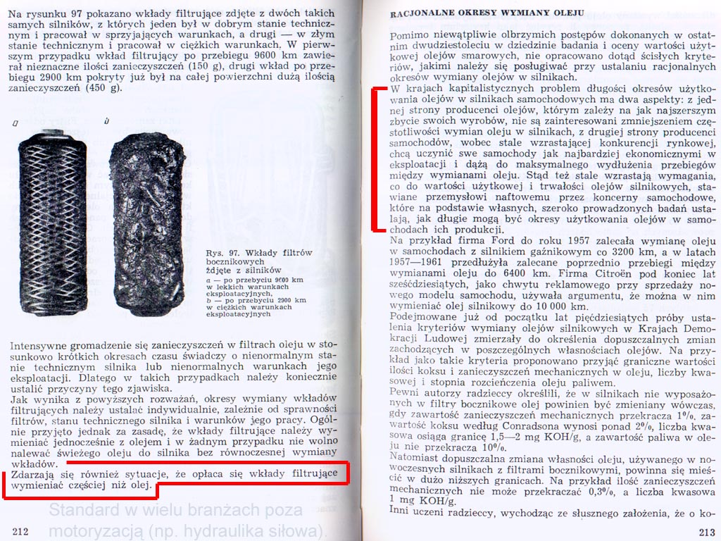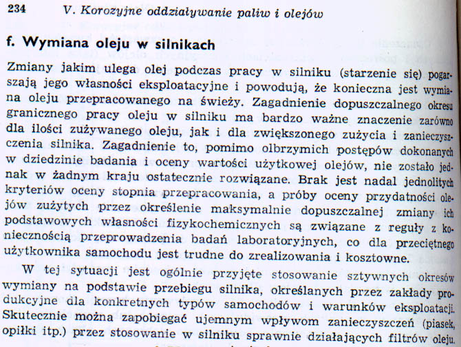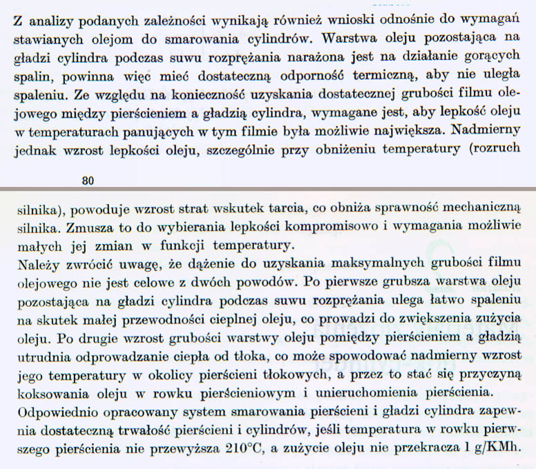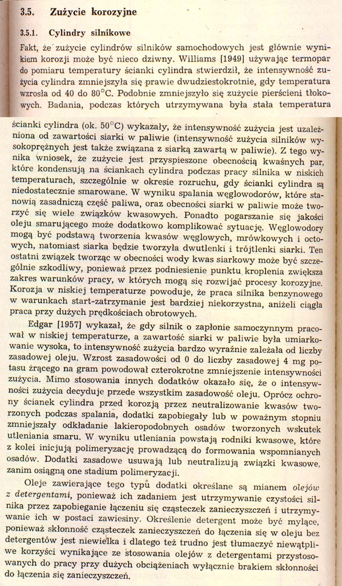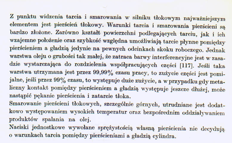 Ciekawostka. W zużyciu cylindrów spory udział (kiedyś dużo większy) miała/ma korozja (równowaga kwasy-zasady), m.in. bo reakcje chemiczne są tak szybkie (jak ktoś wątpi, klasyczny przykład jak szybkie potrafią być, to materiały wybuchowe). Zjawiska chemiczne zachodzą pod wpływem tarcia i/lub temperatury, w skali prawie mikroskopijnej. Wiele dodatków w smarach/olejach dlatego w ogóle działa (bo chemia jest tu główną dziedziną, wcale nie mechanika i uproszczenie tematu do "współczynnika tarcia") albo może być szkodliwa (gdy np. instrukcja zakazuje wlewania do skrzyni biegów oleju "z dodatkami typu EP", to nie wolno, macie się słuchać, bo się zęby szybciej wytrą - to jest dalej w książce, nie zeskanowane na razie). Załącznik: