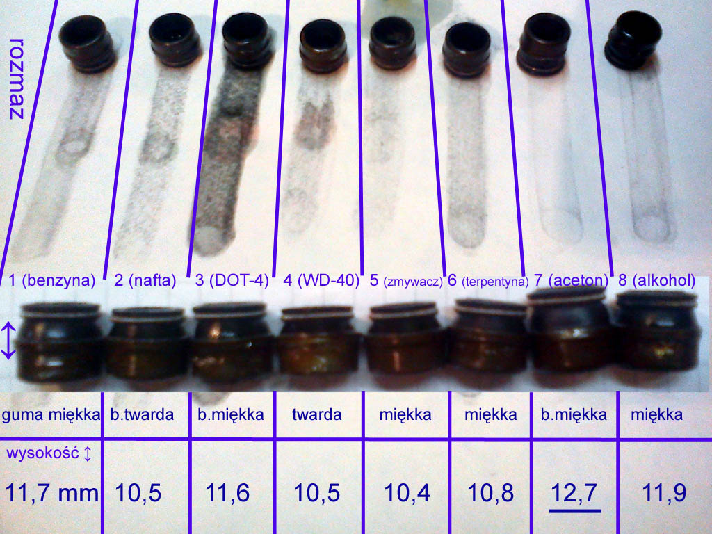 Po tygodniu uszczelniacze zostały wyjęte i każdy potarty, "rozmazany" o papier. Efekty jak na obrazku... Najbardziej guma (nieznany gatunek niestety) klei się i maże się po...płynie hamulcowym, natomiast najbardziej spuchła (przyrosty były głównie na wysokości) po acetonie, a najmocniej zesztywniała po nafcie (w drugiej kolejności po WD-40), można wstępnie założyć, że olejowi napędowemu pod względem właściwości odpowiadają właśnie rzeczy typu nafta i WD-40. Test pokazuje, że żadna chemia obojętna dla gumy nie jest ("coś" się zawsze dzieje). Załącznik: