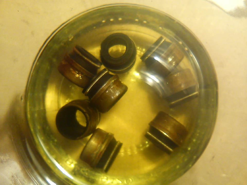 Jeszcze jeden "test", czy uszczelniacze na wcisk trzymają się na trzonku zaworu, czy zrobił się luz. To nic nie znaczy, że jak się na zimno trzyma, to by w trakcie pracy prawidłowo uszczelniał (nie można takich wniosków wyciągać). Po wyschnięciu uszczelniacze wracają do poprzednich wymiarów, z wyjątkiem jednego, z płynu hamulcowego (zmiany są trwałe, to ten jest teraz najwyższy, tamten po acetonie się skurczył). Załącznik: