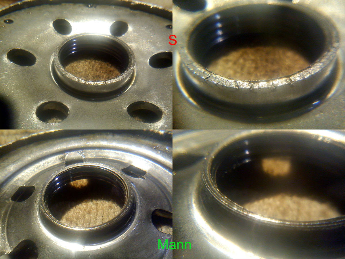 Srajdziszów od razu poszedł pod nóż. Na końcach gwintów sterczą płatki metalu, jak w Filtronie mogą odpaść i polecieć w silnik (przypominam, gwint jest po stronie przefiltrowanej). Dla porównania MANN, dużo lepiej, coś tam jest brzydkiego, ale nic nie odstaje i nie odpada. Załącznik: