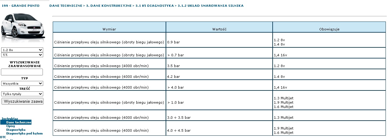 Fotka z dedykacją dla niekumatych (w internecie to plaga), co nadal myślą, że fabryka to geniusze i wszystko precyzyjnie i optymalnie dobrali, aby nie szkodziło (a amator nie ma szans nic usprawnić, poprawić - to się zdziwisz nie raz)...████☻████████☻████___ [ Dodano: 30 Mar 2025, 07:26 ] ___████☻████████☻████ Ciśnienie oleju. Dane oficjalne są takie: https://aftersales.fiat.com/elearnsections/main.aspx?nodeID=199002927&languageID=9&markID=1&modelID=199000000&valID=199000000&prodID=199000000&modelName=Fiat%20-%20199%20-%20Grande%20Punto&langDesc=Polski§ionName=Dati%20Tecnici&validityName=1.2%208v&isExaminer=To są raczej minimalne parametry (więcej może i nawet powinno być). Zrzut ekranu, gdyby strona padła. Podejrzenia pośrednio są udowodnione, że w związku z dodaniem zmiennych faz, niektóre parametry są podkręcone względem starych FIRE, co tu widać po różnicach dla 1,2 i 1,4 8V (gdzie 1,2 w Grande, czyli Euro4, jeszcze VVT nie miało, dopiero w EVO = Euro5). Załącznik: