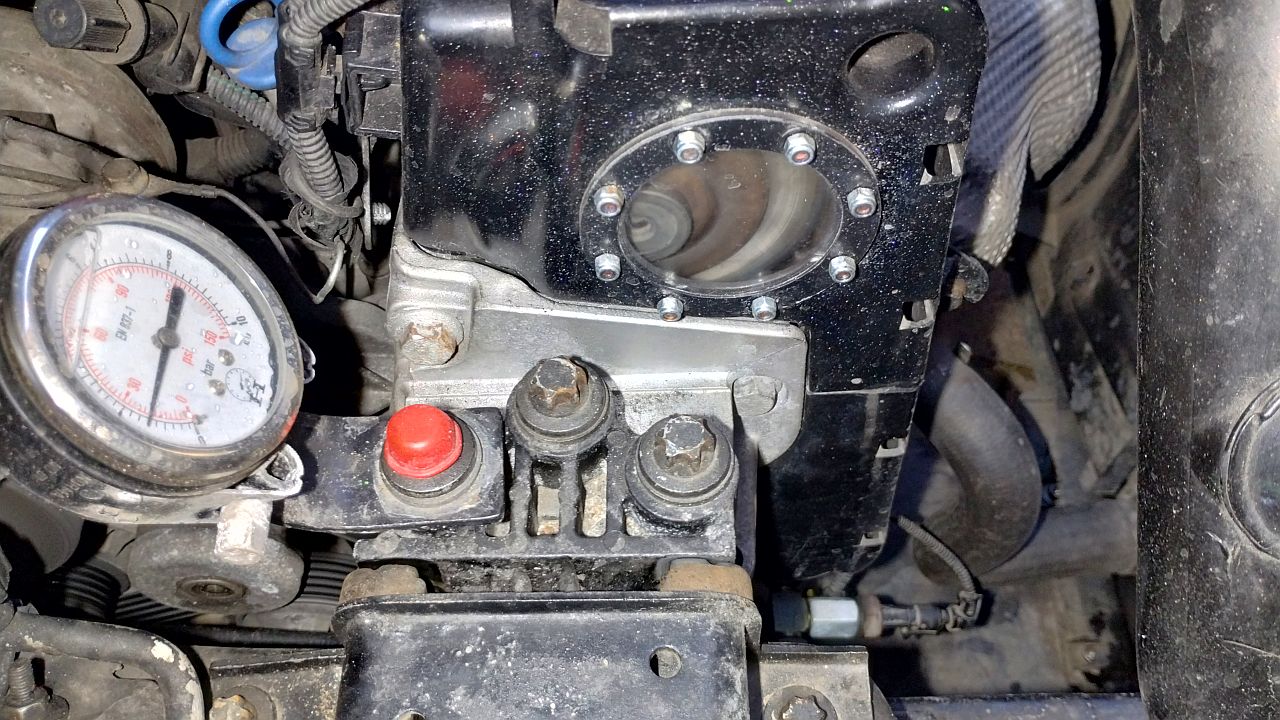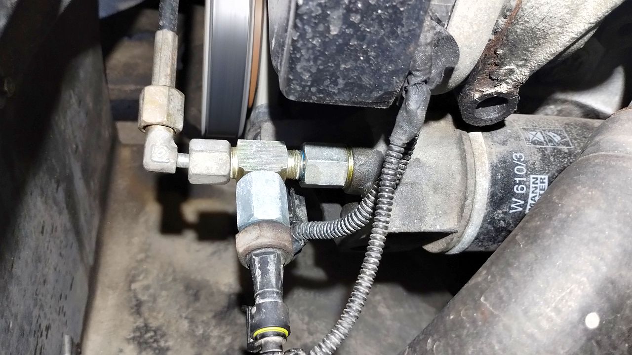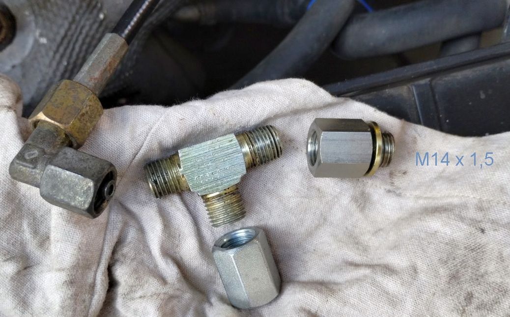Tak to wygląda. Elementy w połowie przypadkowe, z odzysku, nie dobierane za bardzo (pomieszane gwinty proste ze stożkowymi, stąd widać niebieski klej - ostrożnie nałożony, aby do środka nic nie poszło w układ). Ale pasuje i działa. Wiązkę trzeba było trochę "naciągnąć", przesunąć w osłonie rozrządu, ale zapas był na styk. Załącznik: