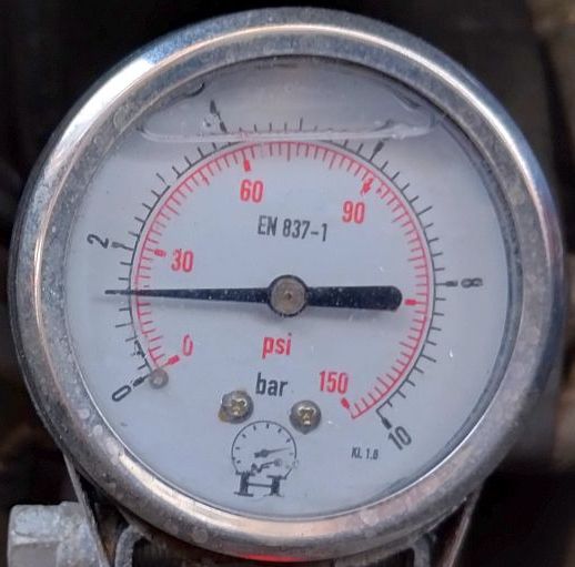 Manometr 6 lub 10 bar. Mocowanie samoróbka (płaskownik + przyspawana szeroka opaska do węży fi. 40-60 chyba). Wersja z płynem, aby tłumiło drgania, to dłużej wytrzyma. Na mrozy glicerynę zastąpiłem olejem silikonowym. Załącznik: