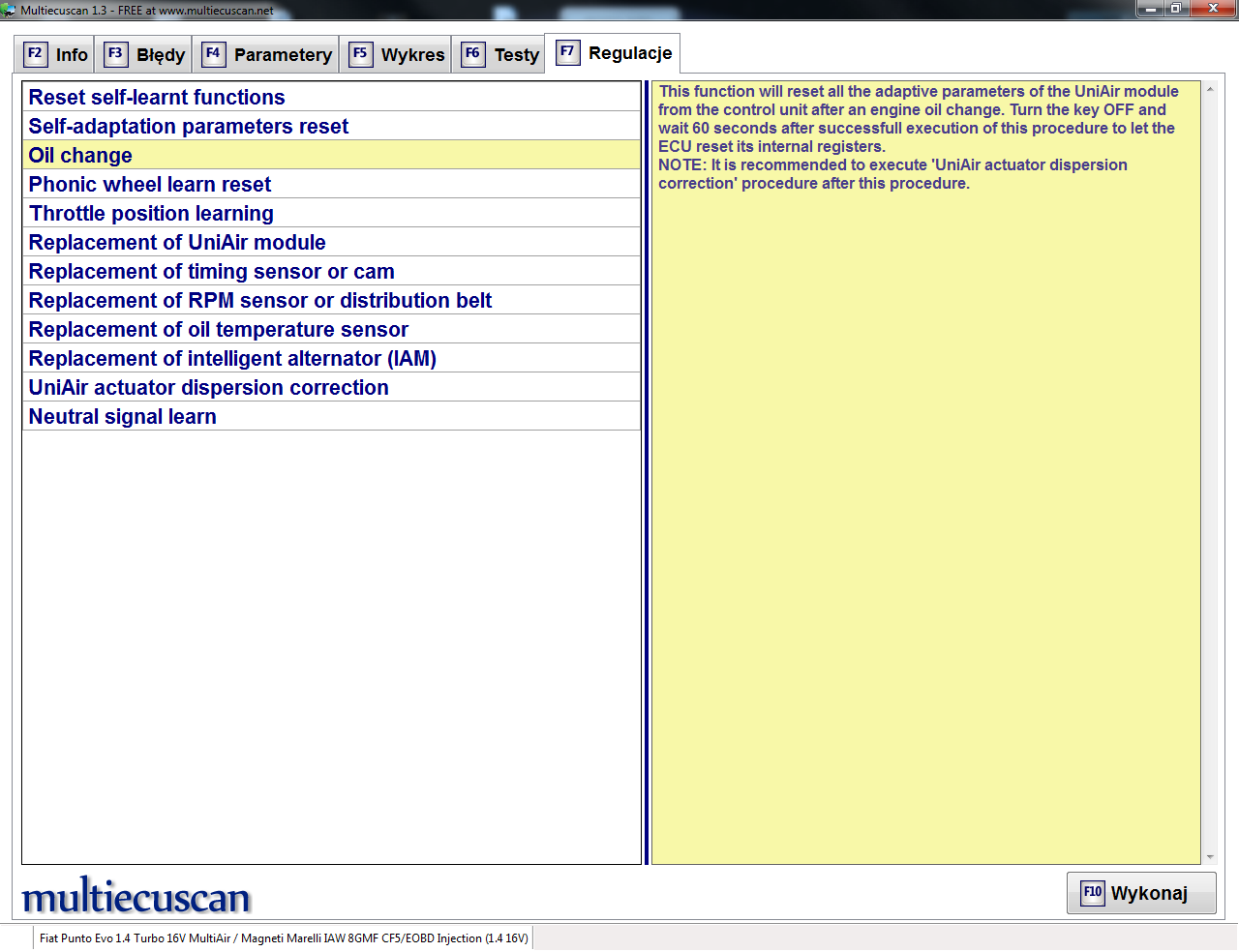 Olej: Selenia K Pure Energy 5W40 ACEA C3, Fiat 9.55535-S2 lub inny 5W40 spełniający ACEA C3 i FIAT 9.55535-S2. Lepiej jednak lać Selenie  Bo jak coś się stanie na GW to mogą być jaja... W tym silniku nie jest tak hop siup spuszczamy olej, wymieniamy filtr, wlewamy i wszystko gra. Dodatkowo po wymianie (Poza resetem daty następnego serwisu) należy przeprowadzić procedurę "Wymiana oleju" interfejsem diagnostycznym i ewentualnie ponowną kalibrację systemu MultiAir. Więc ELM327 z "wylutowanym rezystorem" i żółtą przejścówką oraz MultiEcuScan - pełna wersja są podstawowym wyposażeniem każdego posiadającego ten silnik. No chyba że ktoś serwisuje w ASO, bo Pan "Miecio" mechanik warsztatu "Miecio Profeszynal Service" o tym na 90% nie będzie wiedział... a nawet jak będzie to nie będzie miał oprogramowania odpowiedniego. Trzeba mieć tego świadomość, bo inaczej może się nam MultiAir zepsuć a to słono kosztuje. (~3000zł  )
