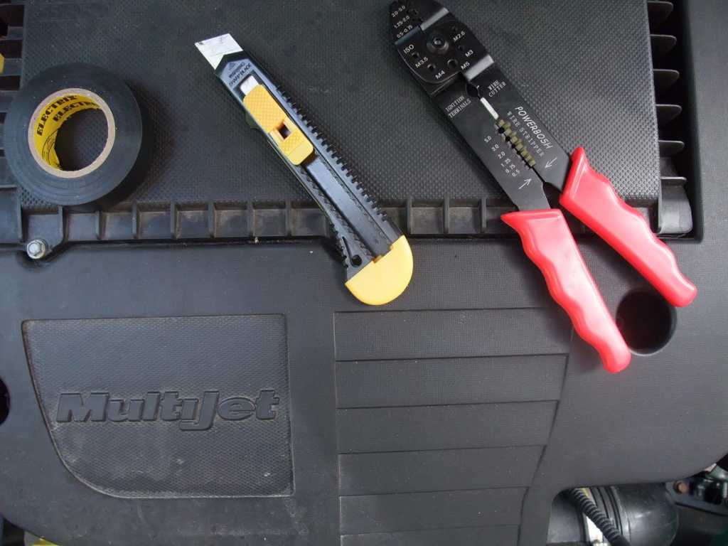 Oczywiście potrzebne będą także narzędzia jak: wiertarka + wiertła, pilnik lub drobny tarnik półokrągły, brzeszczot, nożyk do tapet, klucz np. oczkowy 10, klucz trzpieniowy TORX (do odkręcenia zderzaka) oraz zaciskacz przewodów konektorowych jak na zdjęciu poniżej