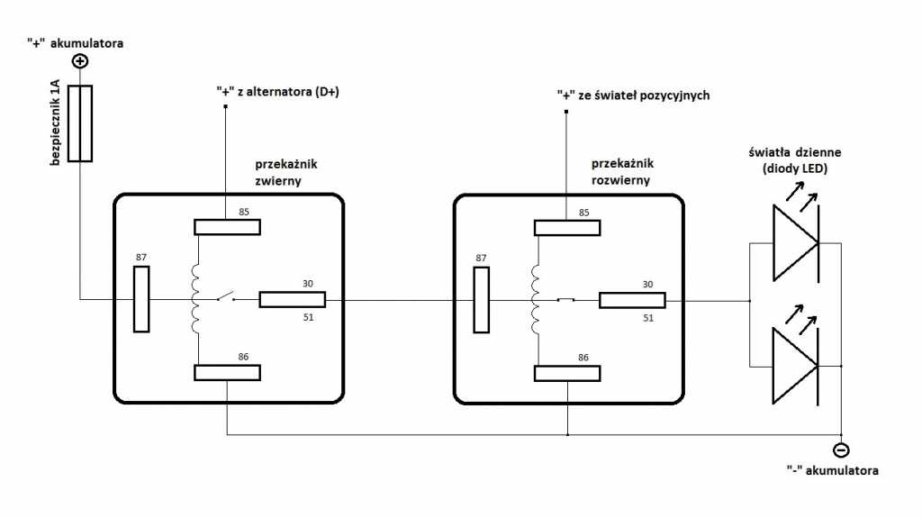 Przyznam, że nie sądziłem, iż jasność świecenia tych czterech diód w światłach DRL jakie zamontowałem, zaskoczy mnie pozytywnie, gdyż mają one tylko 2 x 4W, czyli 8W w sumie, ale w/g mnie świecą jeśli chodzi o jasność przyzwoicie – a do jazdy dziennej wystarczająco. Może ktoś powie, że w jasnym słońcu nie świecą dość mocno, ale w jasnym słońcu auto i tak jest dobrze widoczne. Dodam jeszcze, że są to światła bez automatu w lampach (podobno są to zawodne elementy, gdyż są wrażliwe na wilgoć), lecz na zwykłym przekaźniku rozwiernym, który wyłącza światła po włączeniu świateł pozycyjnych. Dołożyłem jeszcze jeden przekaźnik zwierny, który załącza światła dopiero po uruchomieniu silnika, a nie po włączeniu zapłonu. Zatem światła działają jak najbardziej zgodnie z obowiązującymi przepisami - załączają się po uruchomieniu silnika (a nie od razu po zapłonie) i gasną po włączeniu świateł pozycyjnych. Schemat instalacji poniżej.