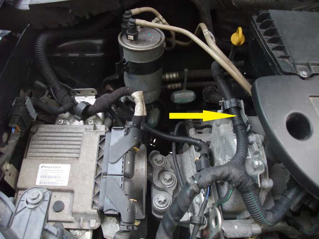 Plus z alternatora wziąłem z wiązki biegnącej od alternatora do komputera, a dokładnie z miejsca na samym silniku u góry z jego lewej strony - przewód szary z czarnym paskiem z miejsca zaznaczonego żółtą strzałką: