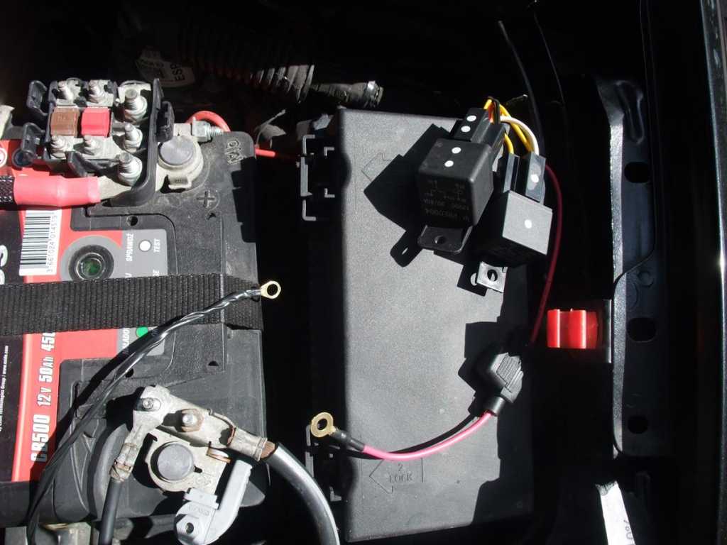 Cały obwód zabezpieczyłem bezpiecznikiem, w tym przypadku nożowym MINI, poprzez który plus z akumulatora podany jest na rozwarte styki pierwszego przekaźnika, następnie zwarte styki drugiego a potem światła. Pierwszy przekaźnik załączany jest plusem z alternatora (styki D+), który pojawia się po uruchomieniu silnika, a drugi przekaźnik, jak wspomniałem załączany jest plusem po włączeniu świateł pozycyjnych. Plus a także minus podłączyłem bezpośrednio z akumulatora, tak było mi najwygodniej, przewodami zakończonymi konektorami z otworami i przykręconymi do zacisków istniejącymi tam śrubami.