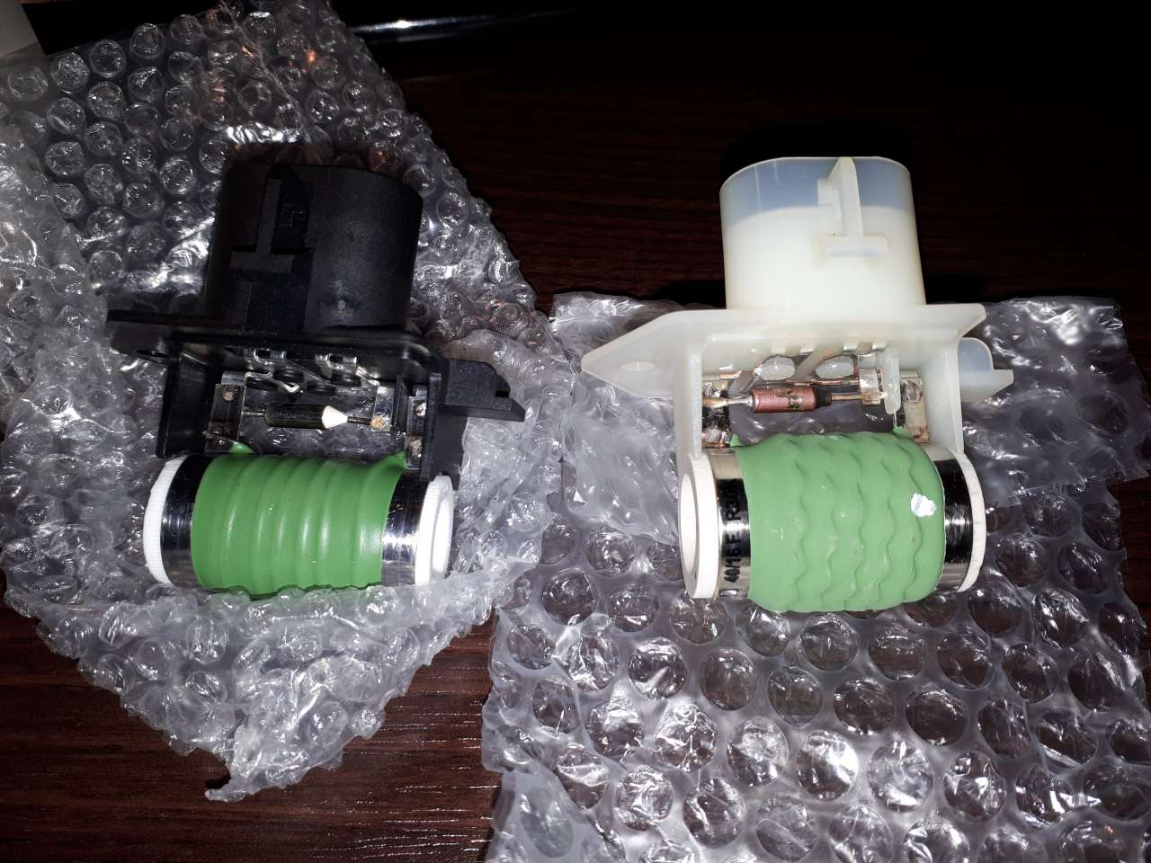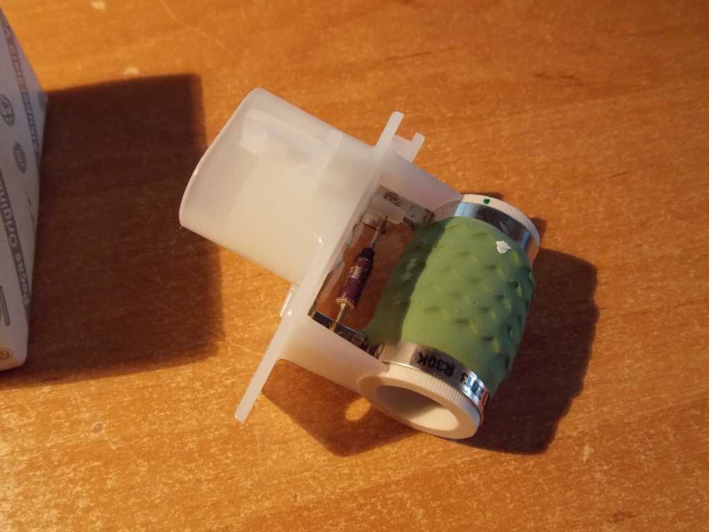Zielony - rezystor Czerwony - termik (bezpiecznik termiczny) Rezystancja termika powinna wynosić 0,00Ohm Rezystancja rezystora w temp 20*C ok 0,5Ohm-a. Niestety parametry termika są mi nieznane - zapomniałem odczytać. W każdym razie najważniejsze to prąd [A] i temp. zadziałania. Prąd może być większy, natomiast temp zadziałania taka sama. Jeśli uszkodzony jest rezystor (b. duża rezystancja) to trzeba całość kupić - koszt ok. 100zł w aso. Jeśli uszkodzony jest termik to za 2-3zł w sklepie elektronicznym lub na allegro kupić nowy i wlutować. <- to samo dotyczy rezystora went. nawiewu Nowy: Załącznik:
