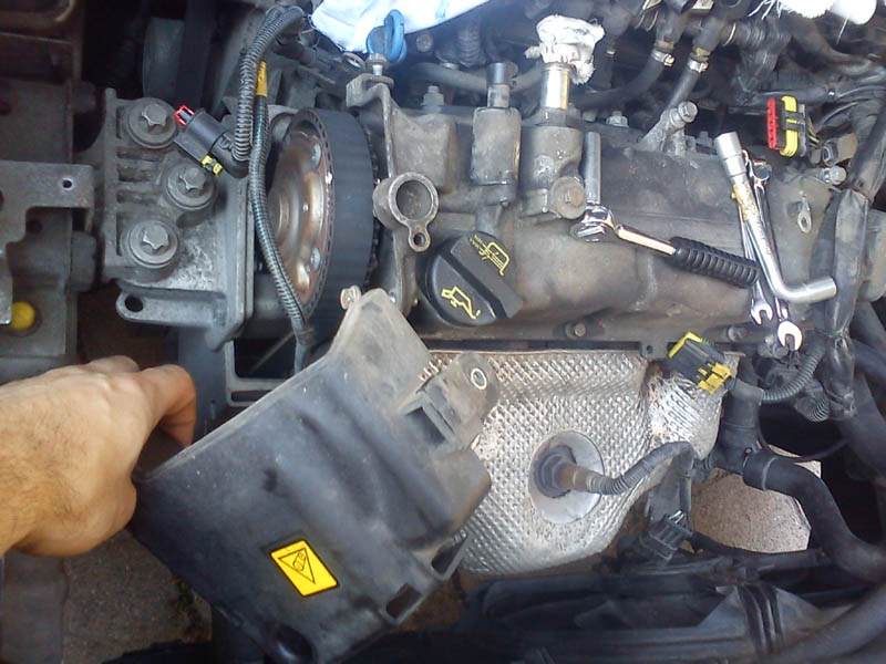 3. Zdejmujemy górną osłonkę paska rozrządu (w niej biegnie jakiś przewód, uważać, nie zerwać). Przy okazji należy obejrzeć stan paska rozrządu (pękanie gumy, itp.). Załącznik: